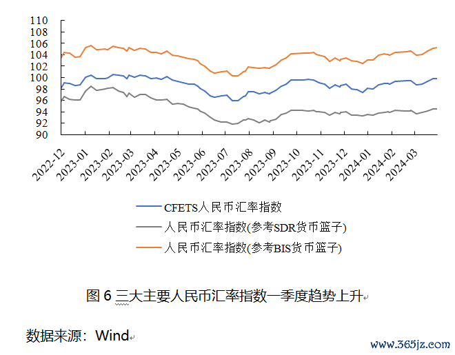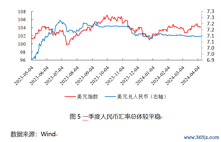 展望未来,外部扰动因素在短期内可能难以消除。特别是美国3月的CPI数据显示通胀水平全面超出预期,这可能会推迟美联储的降息计划。在此背景下,若欧元区在6月如预期降息,美元指数可能保持上行趋势,从而对人民币汇率形成进一步的压力。然而,国内经济和政策层面的积极因素可能有助于维持汇率的基本稳定。随着国内基本面的持续改善和国内金融市场的逐步稳定,跨境资本预计将再度流入。同时,随着外部需求的增强和出口前景的改善,人民币资产的吸引力有望得到提升。另外,中国人民银行在第一季度货币政策委员会的会议中再次强调了防范汇率超调风险和维护汇率在合理均衡水平上的基本稳定的重要性。如果人民币汇率达到历史偏高区间,央行可能会采取综合措施来稳定汇率。随着我国国际收支自主平衡能力的加强,稳健的货币政策足以应对外部冲击和外汇市场的波动。