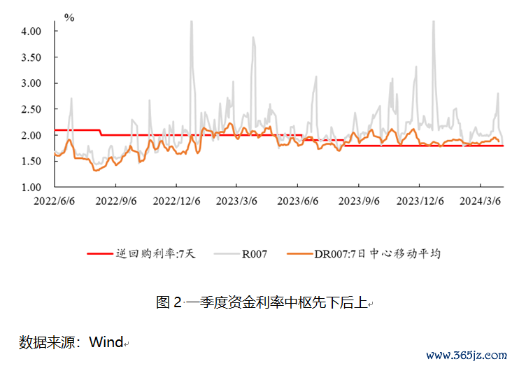 从银行间市场的运行情况来看,第一季度的流动性保持在合理宽裕的状态,资金利率的中心水平较上一季度有所降低。这种宽松的资金面主要由几方面因素推动:降准措施、财政存款的释放以及政府债券发行的缓慢。同时,在关键时期,央行增加了逆回购的规模,尽管如此,公开市场操作总体上仍呈现中性偏紧的态势,资金利率仍然高于政策利率。其中,中期借贷便利(MLF)和1年期贷款市场报价利率(LPR)保持不变,分别为2.5%和3.45%;而5年期LPR则降低了25个基点,至3.95%,创下LPR改革以来的最大降幅。这种短期政策利率的稳定反映了央行在综合考虑汇率压力和银行息差压力后的政策定力。