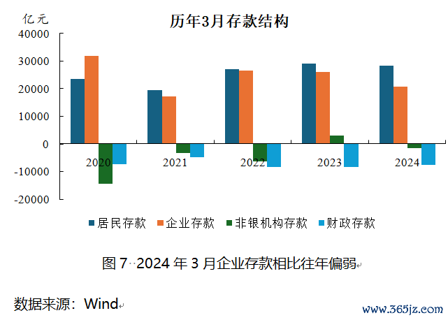 对于一季度M1和M2的波动,主要是春节的错月效应所致。2024年1月M1显著提升,到了2月则回落至去年底的水平,类似于2021年春节前后的波动模式。这一波动除了春节的基数效应外,还反映出当前实体经济的活跃度不高。到了3月,M1增速进一步小幅下降至1.1%,M2增速也降至8.3%。居民存款的高增长有所放缓,3月份增加了28300亿元,同比减少774亿元,显示出居民的存款意愿虽高于往年平均水平,但增速有所下降。企业存款增长20725亿元,同比减少5330亿元。非银行存款减少1500亿元,同比减少4550亿元,这可能与理财规模的下降有关。财政存款的减少幅度较小,显示3月的财政支出力度较为温和。